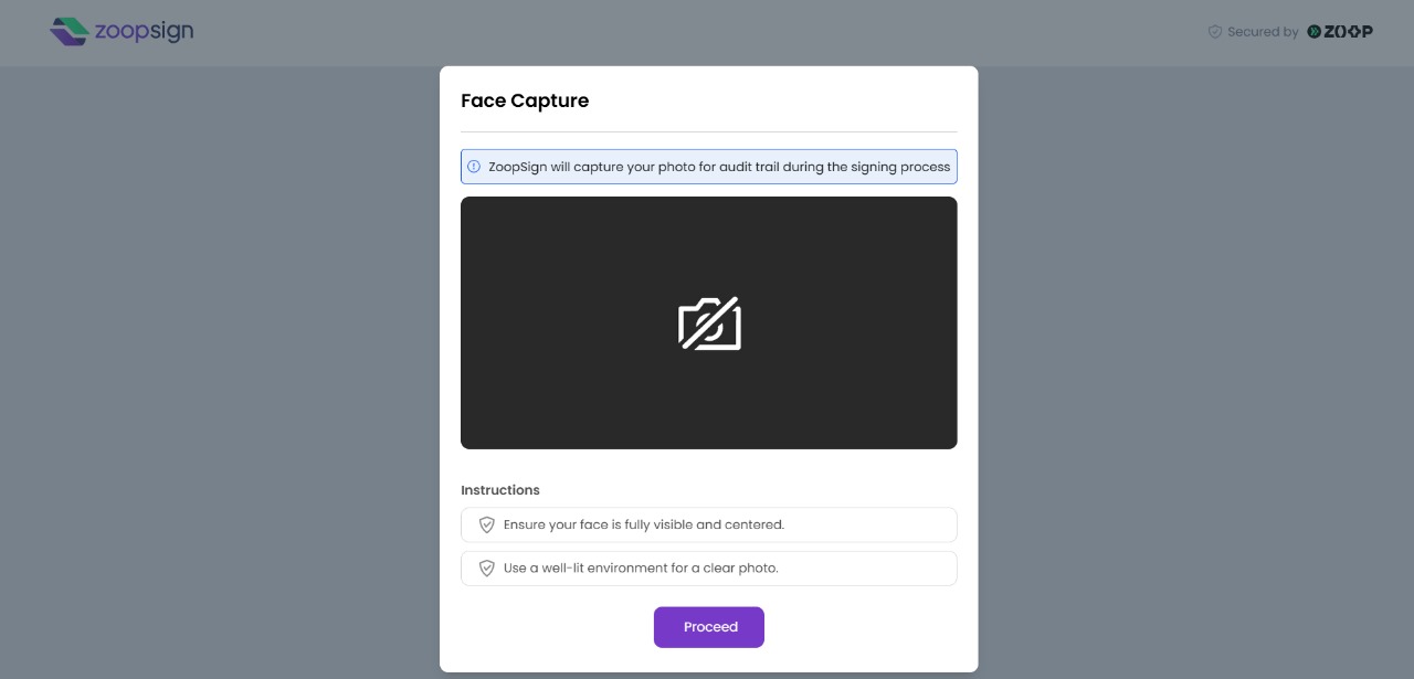The ZoopSign portal requests additional verification, such as a live photo capture for audit trails and location sharing for regulatory compliance. Make sure you are in a well-lit environment and allow camera permissions.